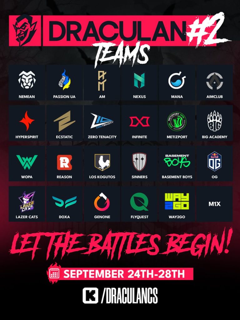 DraculaN Season 2 тэмцээний багуудын жагсаалт гарлаа. Тэмцээн 9-р сарын 24-28-нд Румыны Бухарест хотод болно. Passion UA, OG, FlyQuest зэрэг нэртэй багууд гол оролцогч болно.