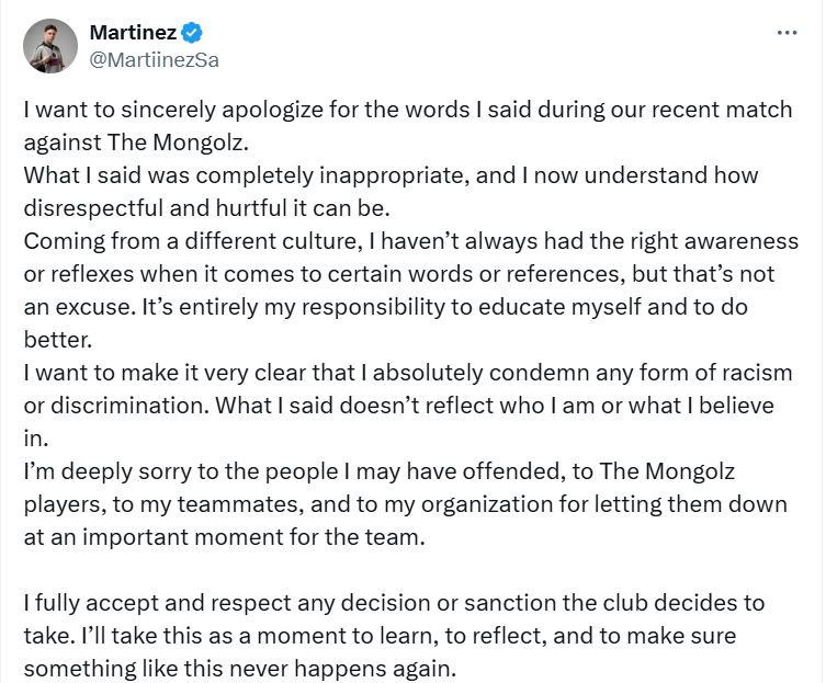 Антонио “MartinezSa” Мартинес ESL Pro League Season 22 тэмцээний үеэр The MongolZ багт хандсан арьс өнгөөр ялгаварласан үг хэлснийхээ дараа олон нийтээс уучлалт гуйлаа.