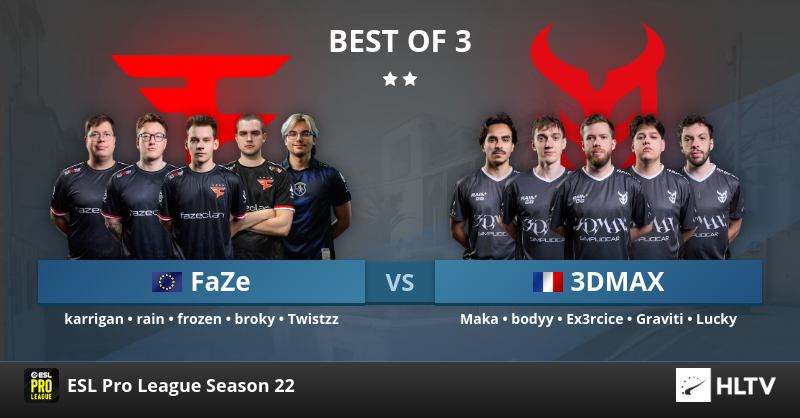 3DMAX баг ESL Pro League Season 22-ийн группийн шатны хоёрдугаар тойрогт FaZe Clan-ийг 2:0-ээр бут ниргэлээ. Тоглолт Train дээр 13:9, Dust2 дээр 13:11 гэсэн оноотой өндөрлөв.