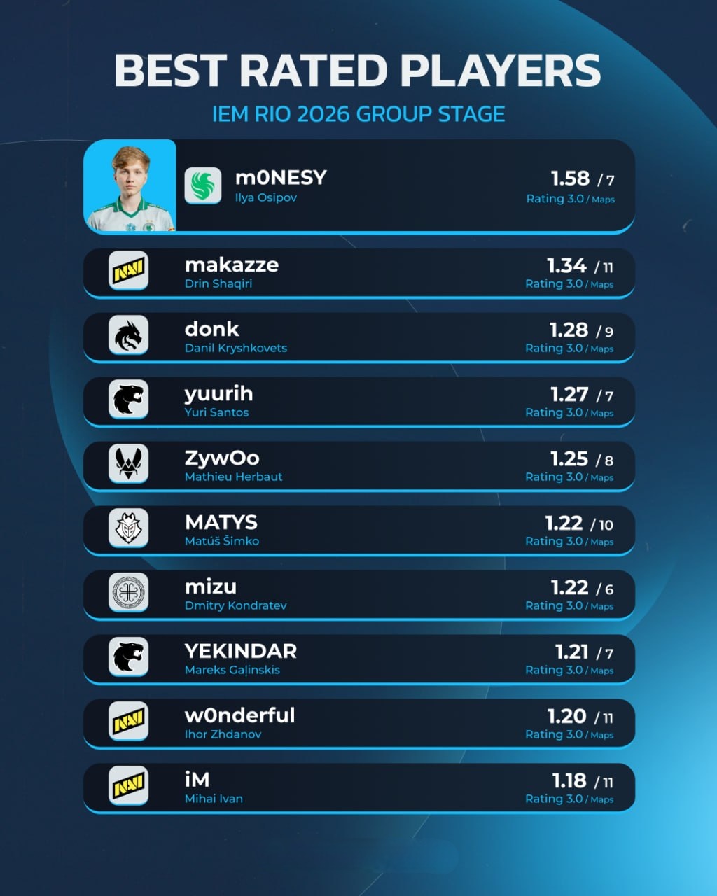 Жагсаалтаас анхаарал татаж буй нэг зүйл бол Natus Vincere (NAVI) багийн багийн ажиллагаа юм. Тэдний гурван ч тоглогч (makazze, w0nderful, iM) шилдэг аравт багтсан бөгөөд тус бүр 11 map тоглож энэхүү өндөр үнэлгээг хадгалж чадсан нь тэдний тогтвортой байдлыг илтгэж байна.