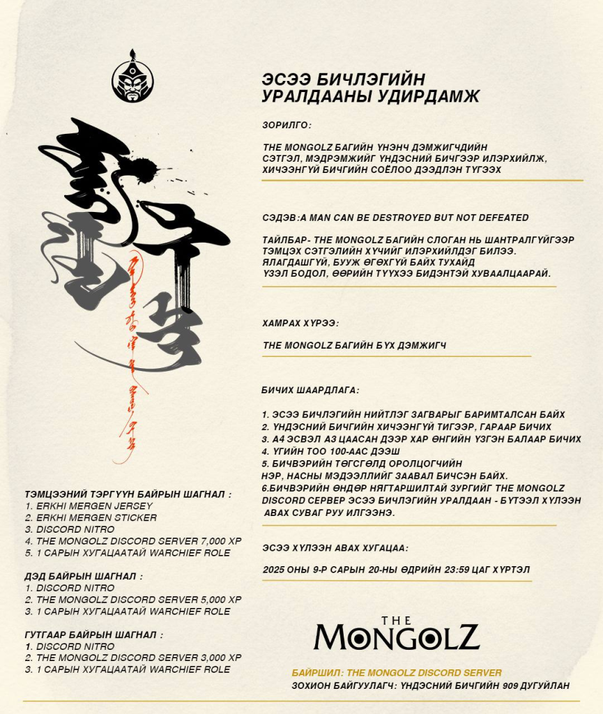 Бэлэн болсон бүтээлээ зураг болгон авч The MongolZ Discord серверийн “Эсээ бичлэгийн уралдаан” сувгаар илгээх юм.