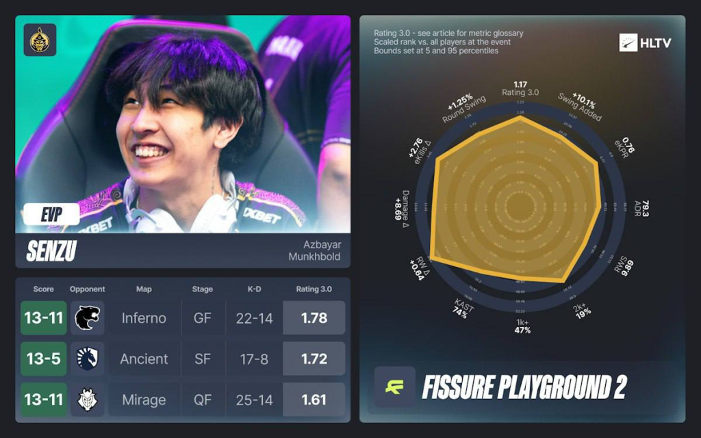Белград хотод болсон FISSURE Playground 2 тэмцээнд The MongolZ баг FURIA-д хожигдон хоёрдугаар байр эзэлсэн ч, хоёр Монгол тоглогч — Азбаяр “Senzu” Мөнхболд болон Аюуш “mzinho” Батболд онцгой амжилт үзүүлэв.