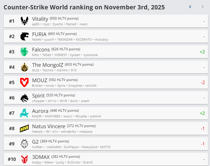 Team Vitality дахин нэгдүгээр байраа хадгалсан бол FURIA Esports хоёрт бичигдсэн байна. Team Falcons баг IEM Chengdu 2025 тэмцээний эхний ялалт болон ESL Pro League Season 22-ийн хоёрдугаар байрны амжилтынхаа ачаар топ-3 байранд орлоо. Тэд The MongolZ болон MOUZ-ыг гүйцэж, дөрөвдүгээр байр руу The MongolZ баг шилжсэн байна.