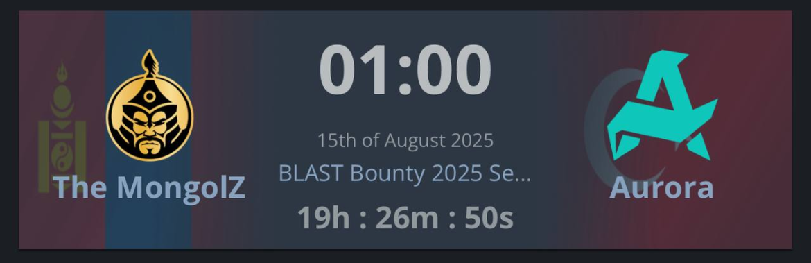 2025 оны 8-р сарын 14-ний өдрийн оройноос хойш Монголын The MongolZ баг өнөө шөнийн 01:00 цагт (Улаанбаатарын цаг)-аас эхэлж, Туркийн Aurora багтай BLAST Bounty 2025 Season 2 Finals тэмцээний хүрээнд тулалдах гэж байна. Энэхүү тоглолт нь тэмцээний чухал шатанд болох бөгөөд хоёр багийн хоорондын өрсөлдөөн сонирхолтой байх магадлалтай.