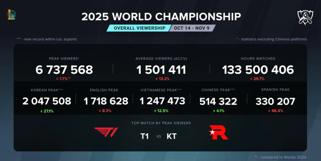 Статистикийн портал Esports Charts League of Legends-ийн дэлхийн аварга шалгаруулах тэмцээн Worlds 2025-ийн шинэчилсэн үзэлтүүдийн мэдээллийг нийтэллээ.